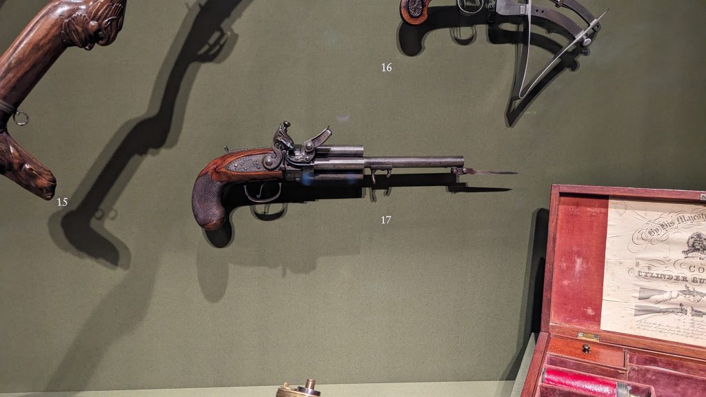 Collier built handguns, rifles, and shotguns with his revolving design. Most held five rounds, and some even included built-in bayonets. One of the big selling features was that Collier’s only had one lock and one frizzen. Most flintlock revolvers had a separate lock and frizzen for each chamber. The Collier/Wheeler design was simpler and more robust.