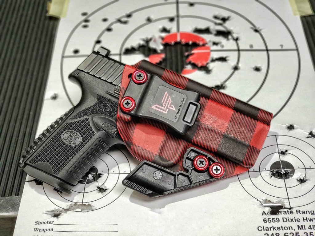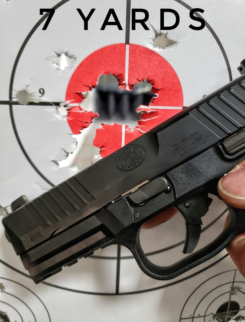 My first trip to the range I was a little skeptical of the pistol’s abilities. The trigger had a little bit of a gritty feel to it at first and I was not a fan of how tall and bulky the sights looked. I loaded up 2 full magazines and decided to jump right into it. The first 15 rounds struck the paper at a distance of 7 yards. When the smoke cleared, I was shooting consistently low and a little left. It was a great grouping though at less than 1 inch. I’m positive that this was due to shooter error because of the sights. I am used to Sig style sights and the FN has a little bit different sight picture.