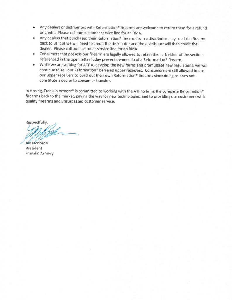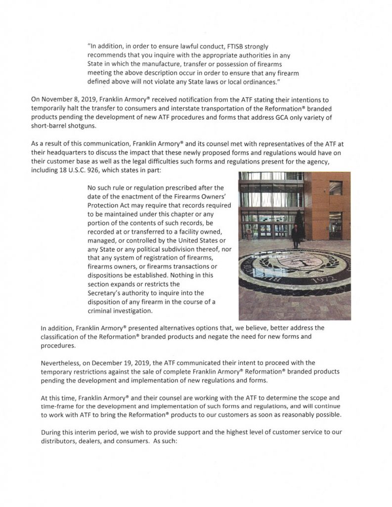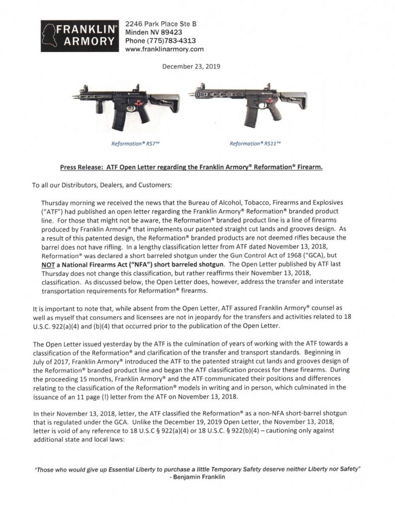 For those curious, the ATF issued an opinion letter on the classification of the Reformation ‘straight rifling’ firearm that made it into a Gun Control Act Short Barrel Shotgun. It is the first of its kind in the classification and their have been no rules yet formalized to keep transferring the Reformation, with the exception of between most FFL’s.