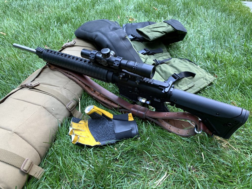 Tools for a High Power Match; shooting mat, glove to reduce vibrations from hand to rifle, shooter’s coat and of course a custom rifle with optic.