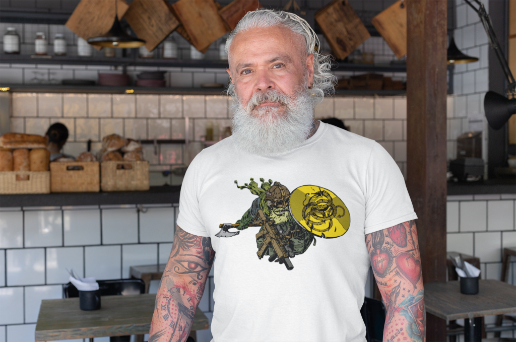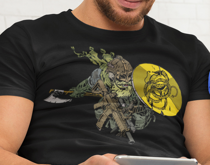 It’s an expansion of their Viking-themed line of Norse shirts. Like some of its predecessors, it features a Nordic berserkr, but this rager is carrying a Gadsden flag shield with Jormungandr on it in place of a rattlesnake.