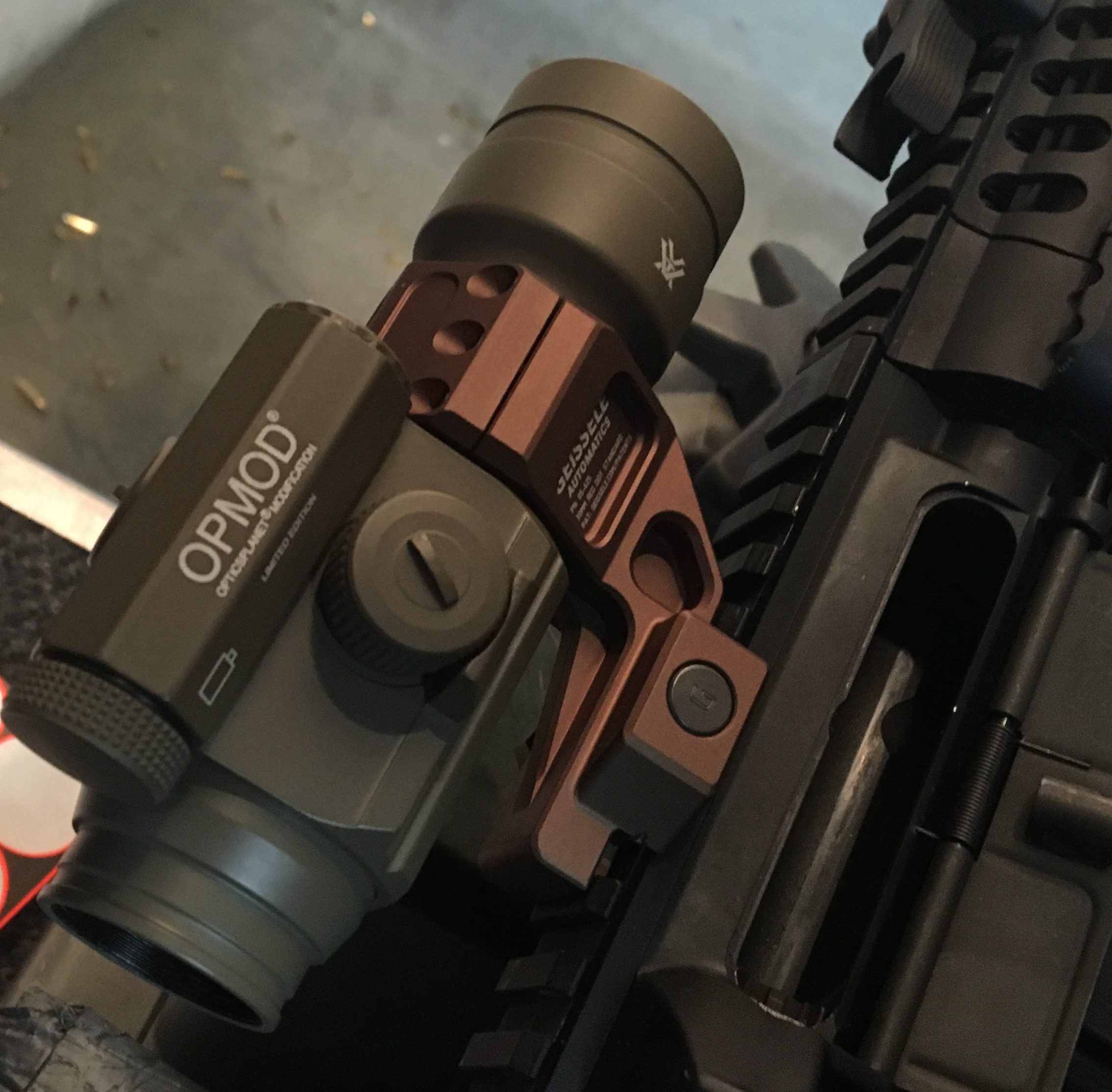 The Midwest Industries mount in the picture has one anti-sheer lug and a large lateral clamping surface. It’s a fantastic mount but requires the forward bias mounting method and with too little lateral clamping force the optic will slide forward and backward. It’s quite easy to to set correctly and once done the mount works exceptionally.