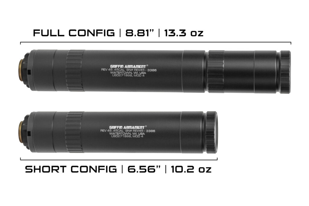 Griffin Armament broke ground with their original Revolution 9 and 45 suppressors with the user-customizable modular length feature. The new (MOD 4) Revolution 45 suppressor builds on that history, but is a total redesign. Griffin focused on user feedback, and the MOD 4 is more secure and easier to mount. It’s also fast and easy to configure and to disassemble for maintenance.