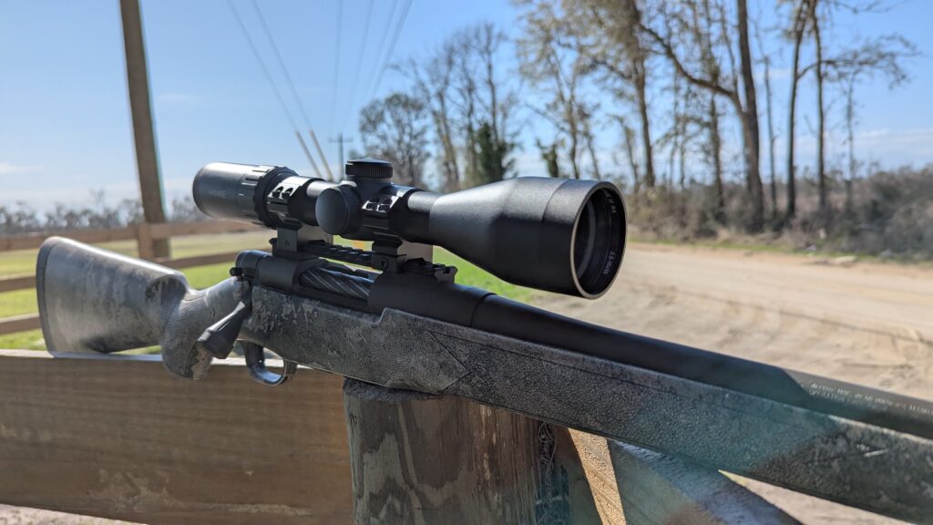 My rifle shoots 6.5 Creedmoor, so it’s not a magnum shoulder thumper, but I still appreciate the 3.5-inch eye relief. It’s comfy and allows you to snap behind the gun. The field of view isn’t bad, with 12.6 feet visible at 100 yards with the magnification set to 10X.