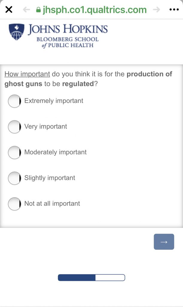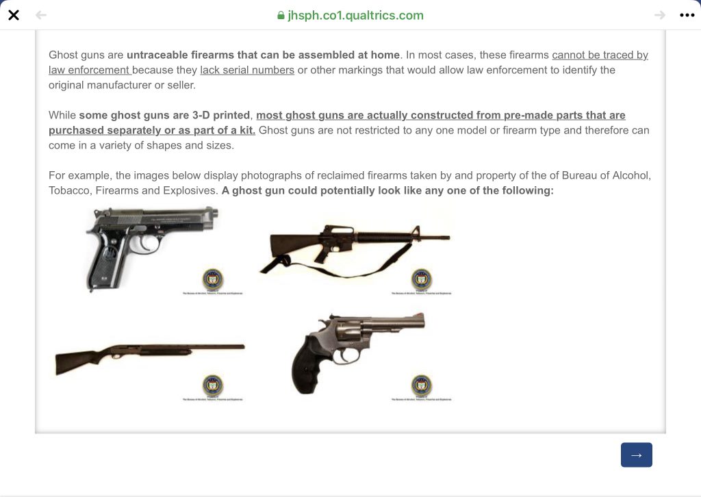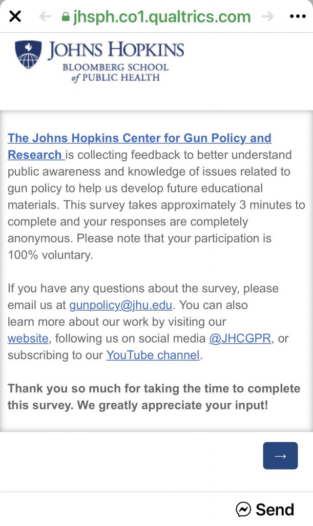 You may have seen this “survey” link from the Johns Hopkins Bloomberg School of Public Health going around the past few days. Go ahead and take the survey to give them insight from actual gun owners – if you can stomach the slanted response choices that is.