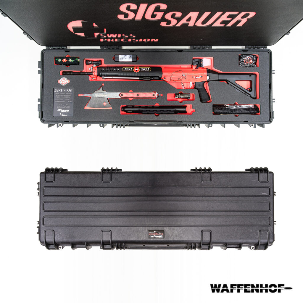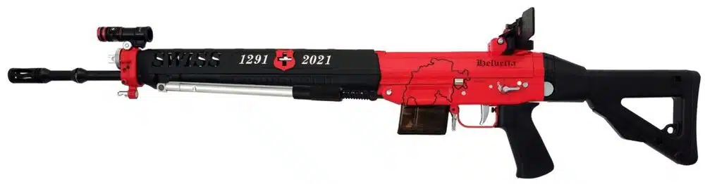 The rifle bears the dates 1291 and 2021. It was made to celebrate the 730th birthday of Switzerland. The handguard also says Swiss on it. There is a relief of Switzerland on the receiver, but it cuts off Geneva, a major Swiss city. The Rutli Oath is printed on the gun in German as well.