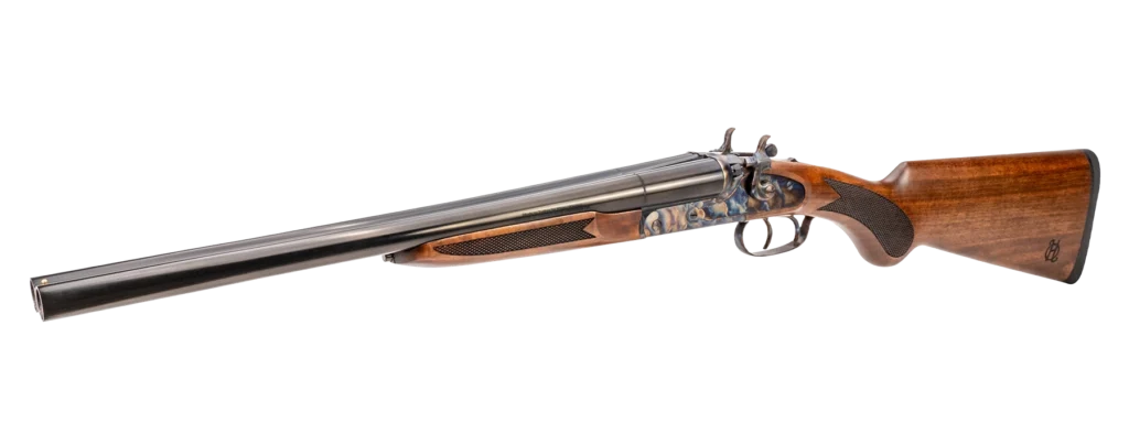 The Heritage Coachwhip is a side-by-side coach gun that exudes 19th-century style. It has a 3″ chamber, so it will fire both 2-3/4 and 3-inch shells. The barrels are 18.5 inches long and have a brass bead front sight and cylinder bore. The barrels are finished with black chrome, that mimics the deep rust blueing of old. The frame has a case-hardened finish. The buttstock and foreend are of rich Turkish walnut. The Coachwhip has fine checkering on the pistol grip and foreend.