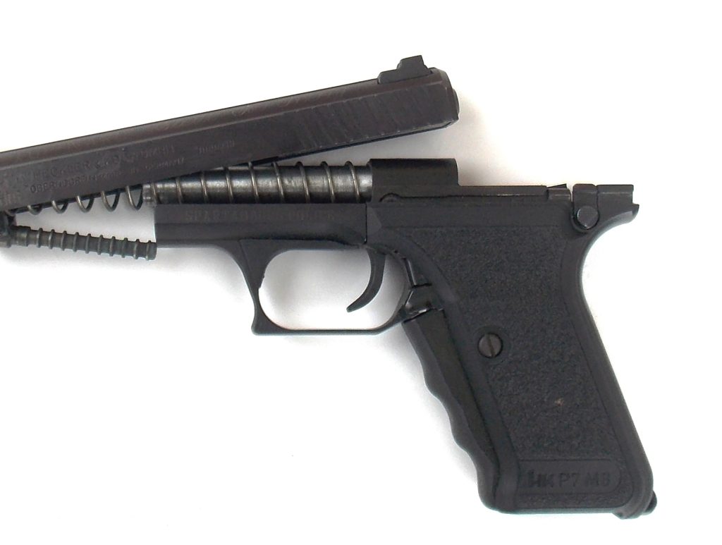 The piston limits rearward motion of the slide. After the bullet has exited the barrel, pressure abates and the slide recoils. Operation is then much like any other blowback pistol. I caution though that due to the gas system the front of the dust cover heats up in firing drills. . Gloves are recommended if you are firing more than 100 rounds during a range session. While there are certain drawbacks-a prohibition against lead bullets and the heating up of the receiver-P7M8 fans will hear no complaints. The pistol is very accurate.