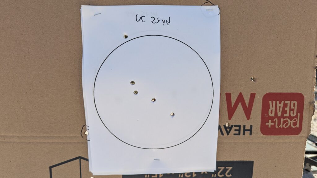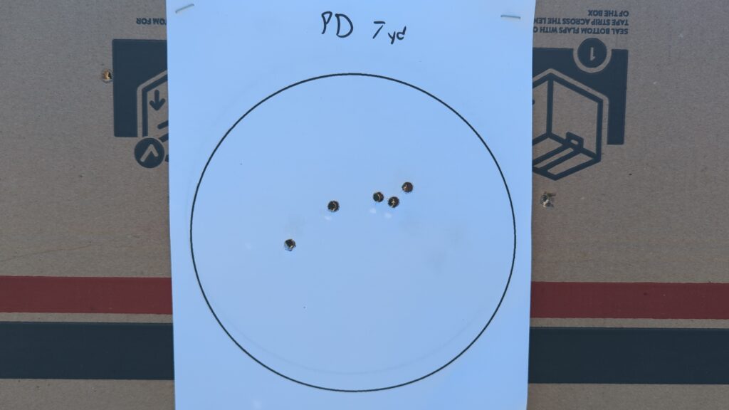 The testing consisted of shooting five-round groups at each range. At 7, 15, and 25 yards, my target was an eight-inch circle. Think of it as a “bitchmade B8” because the scoring rings make me crack under pressure. At 50 yards, my target was an IPSC-sized steel target.
