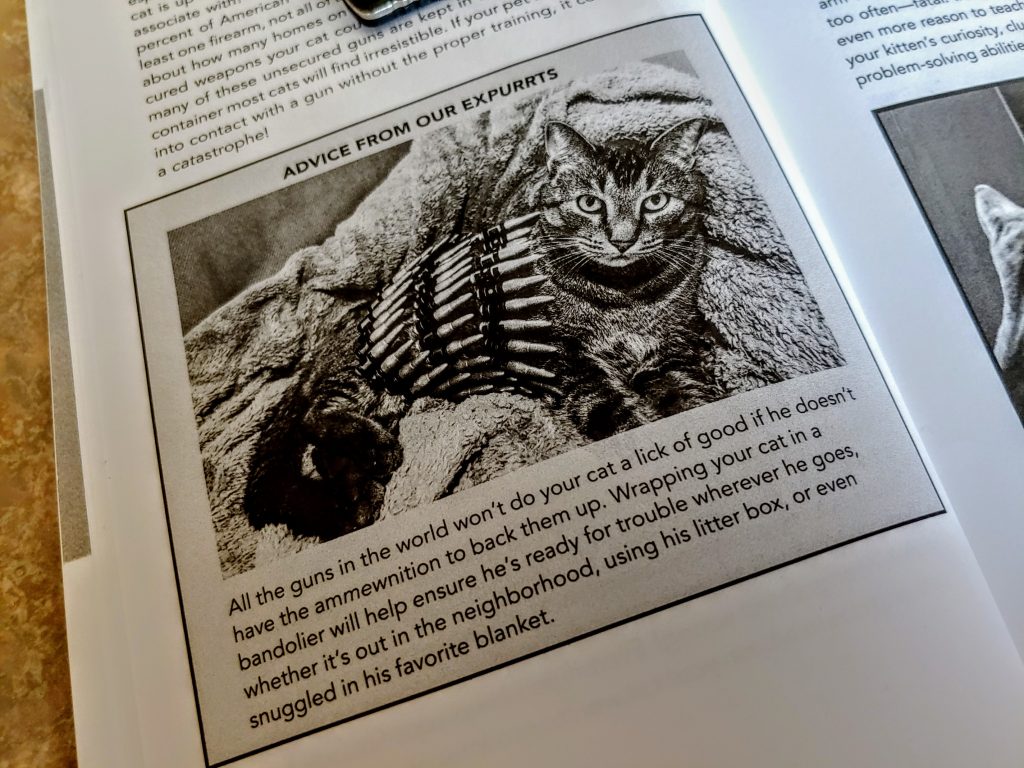 The book isn’t just a rehash of how to teach humans, or dogs, or gerbils about gun safety, it’s specifically about how to talk to cats and what affects felines and gun safety. There is some solid and pertinent advice in training your kittens on how to use guns. Even advice on how to choose the right gun for your cat. Your Cat’s Gat should be within their skill level and guns like the Desert Eagle 50 AE and Barrett 50 Cal should be reserved for only the most skilled felines. A AR 15 with a shot 300 Blackout upper is likely the best beginner’s choice outside of a 22 LR.