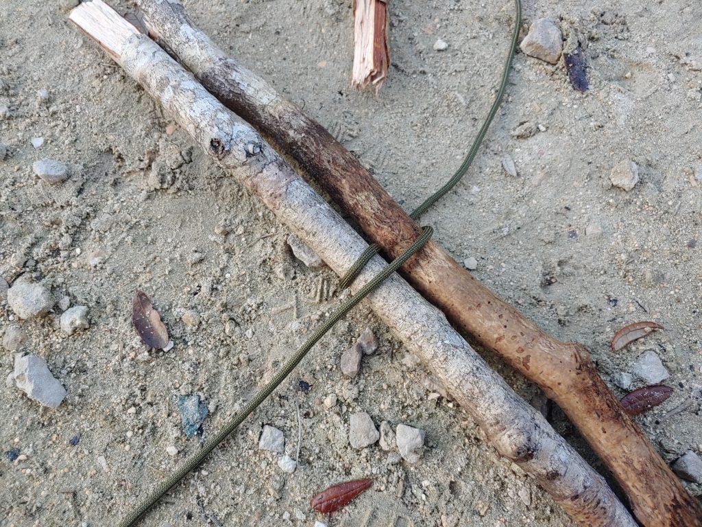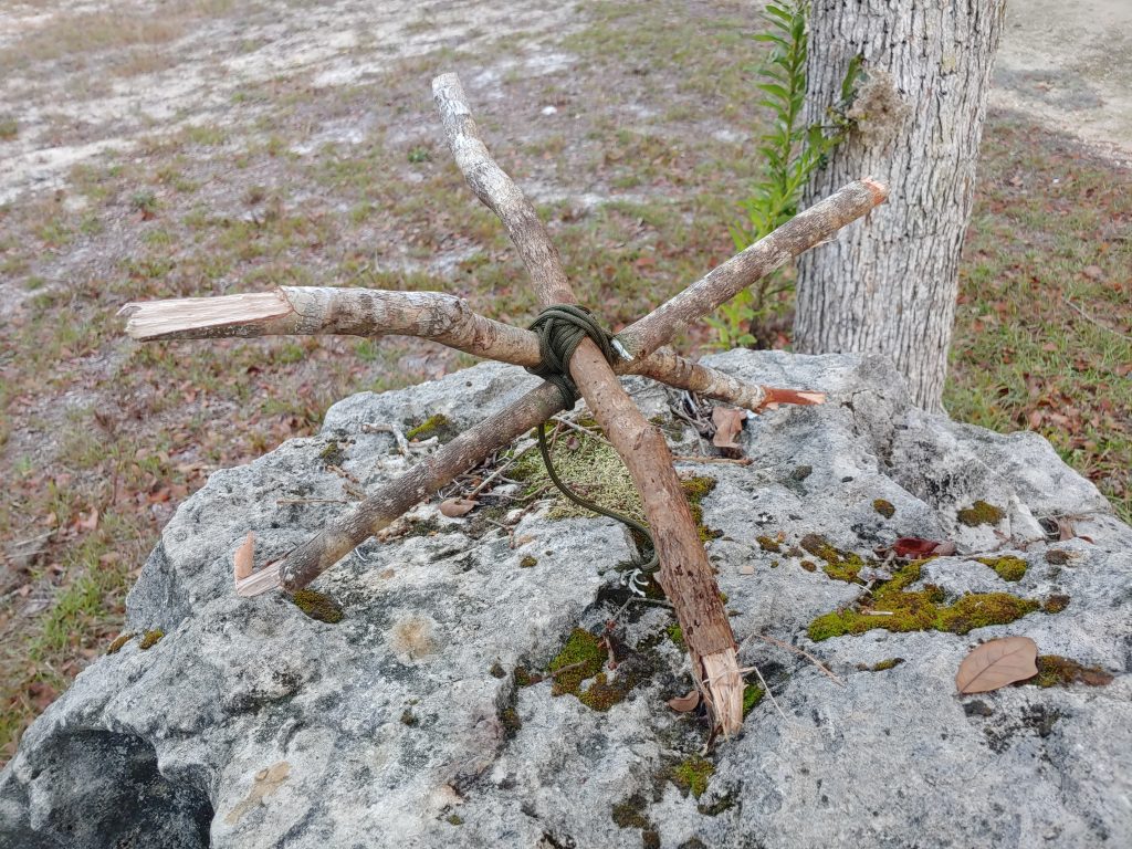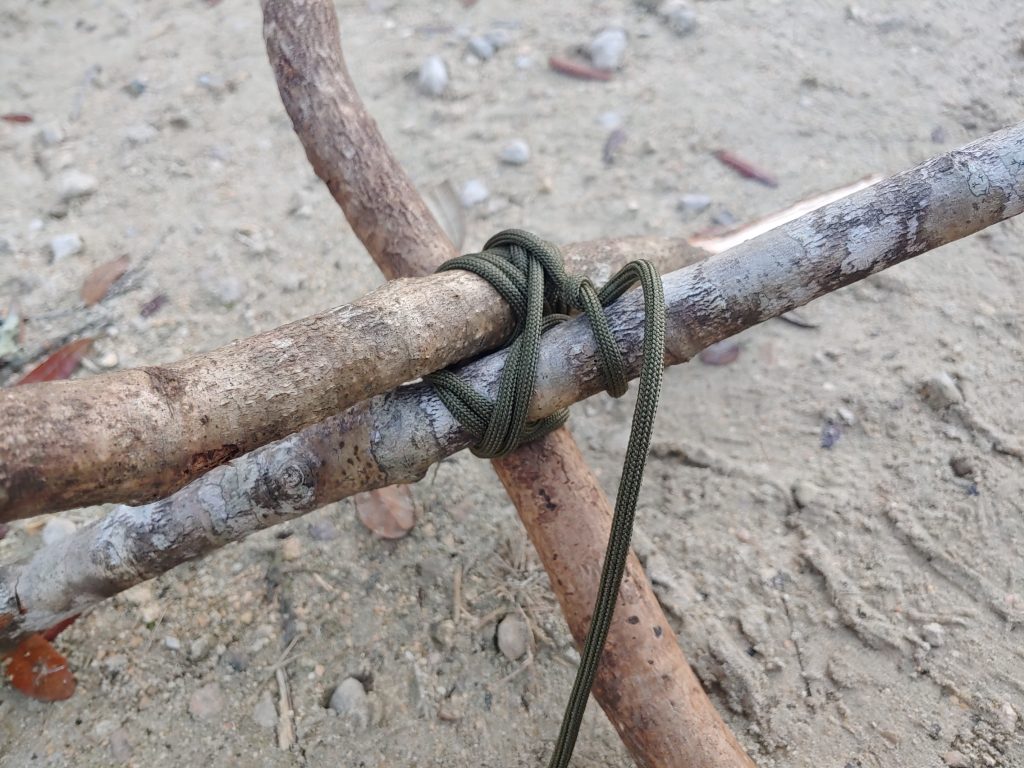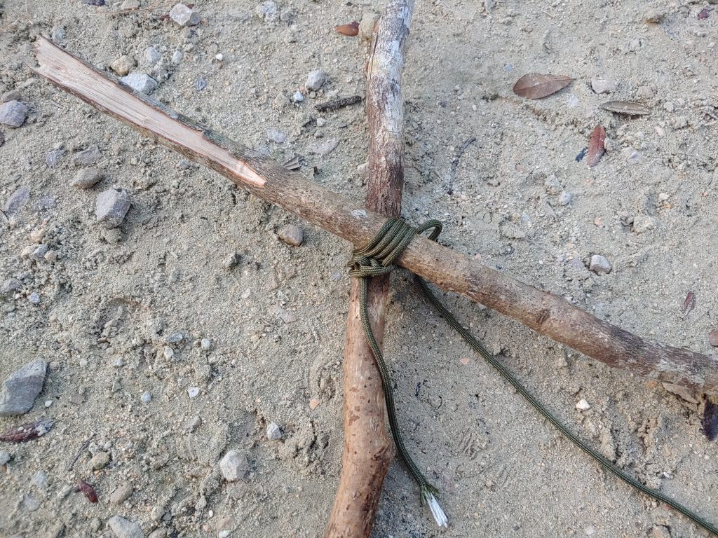 The binding has to be tight, or it will not support the weight of the weapon when its tasked to once you have a rugged, tight, and strong X grab your third stick. You will attach the final stick to the bottom of the X. It needs to be bound very tight to provide support and prevent collapse. Go around the bottom of the stick and through the top of X once more. Once it’s tight, take your tail and tie it to any of the limbs.