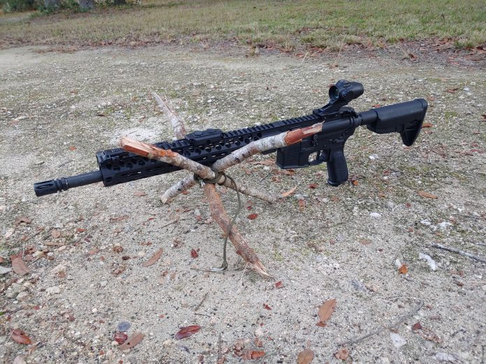 Once it’s tied together, rest your rifle on the support and see if your field improvised shooting rest can support the weight. If it cannot, your sticks are likely not bound tight enough. Retighten it until it can support the weight of the weapon without collapsing. Your next test will be shooting with it. The heavier the recoil, the tighter your binding needs to be.