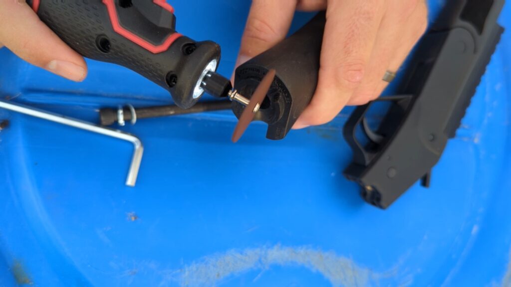 We’ll slowly erase the upper 1/3rd of the protrusion with the Dremel and a good cutting wheel. It’s not a big deal if you cut more than that. You just need to cut enough to keep the protrusion from blocking the grip from sliding into the slot. Once the grip can fit into the slot, we can bolt things down.
