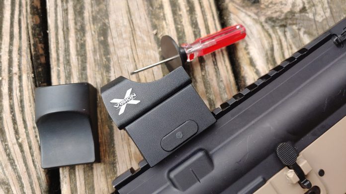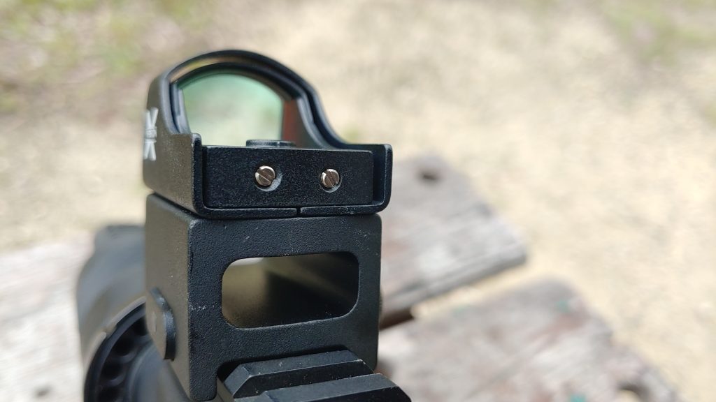 Let’s start simple and mount the X-Vision dot to a simple .22LR AR pistol. Nothing too rough to see how the design zeroes and get a general feel for the dot. It mounts easily enough, and I set it up to zero. What I first noticed was how clear and crisp the dot it. It seems larger than 3 MOA, but it’s almost absolutely perfectly round and so very clear.