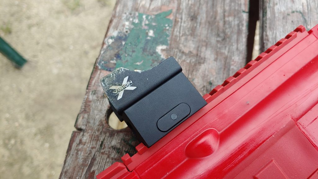 The battery is bottom mounted, and there is a metal shroud that wraps around the entire optic for another level of protection. This is a 6061 hood. There are no buttons, and it’s an auto-adjusting design. Since the dot has no settings to turn it ‘off,’ you toss a hood on it. Not too big of a surprise with the cheapest red dot on the market. The X-Vision HIIT is firmly attached to the Picatinny mount. Overall the optic looks cheap, but not as cheap as I expected.