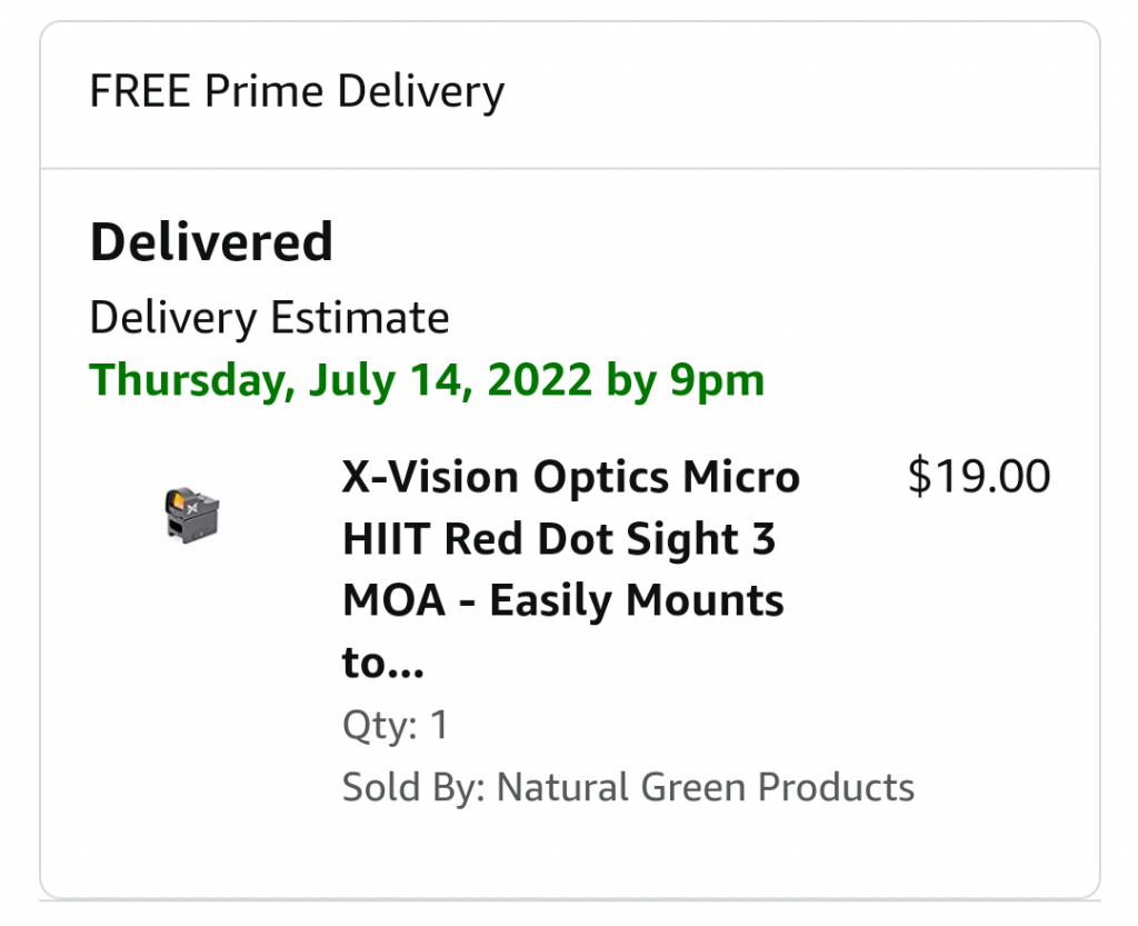 Eventually, I found the cheapest red dot designed for actual firearms for a whole 19 dollars. The X-Vision Optics Micro HIIT Red Dot Sight. What does HIIT stand for? I have no earthly idea. Who is X-Visions? I have no idea. I do know it cost me 19 bucks and I hit buy it now and patiently waited for my two-day shipping to kick in.