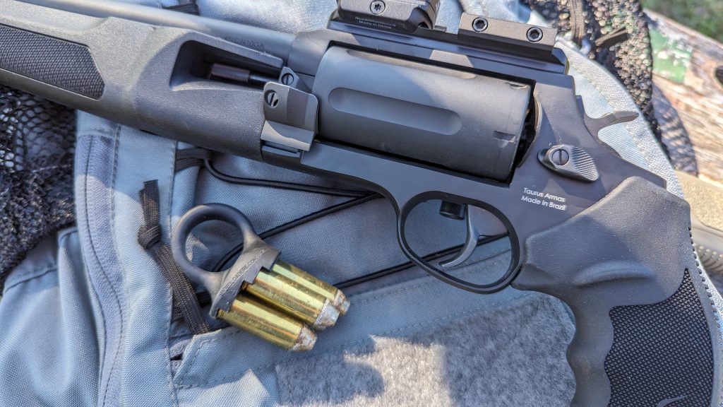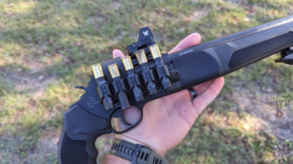 With .45 Colt, I produced a fifty-cent-sized group at 25 yards, so for a longer range, it’s an option. I will still defer to the preference of buckshot.