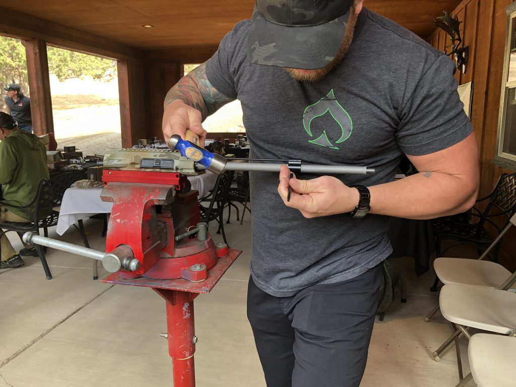 KJ of GunTalk putting in the RA Trigger as I do… something… probably about to torque the ATLAS barrel nut, in the background. There were stations for the specialty tool items, specifically torquing the barrel and putting the receiver extensions on.