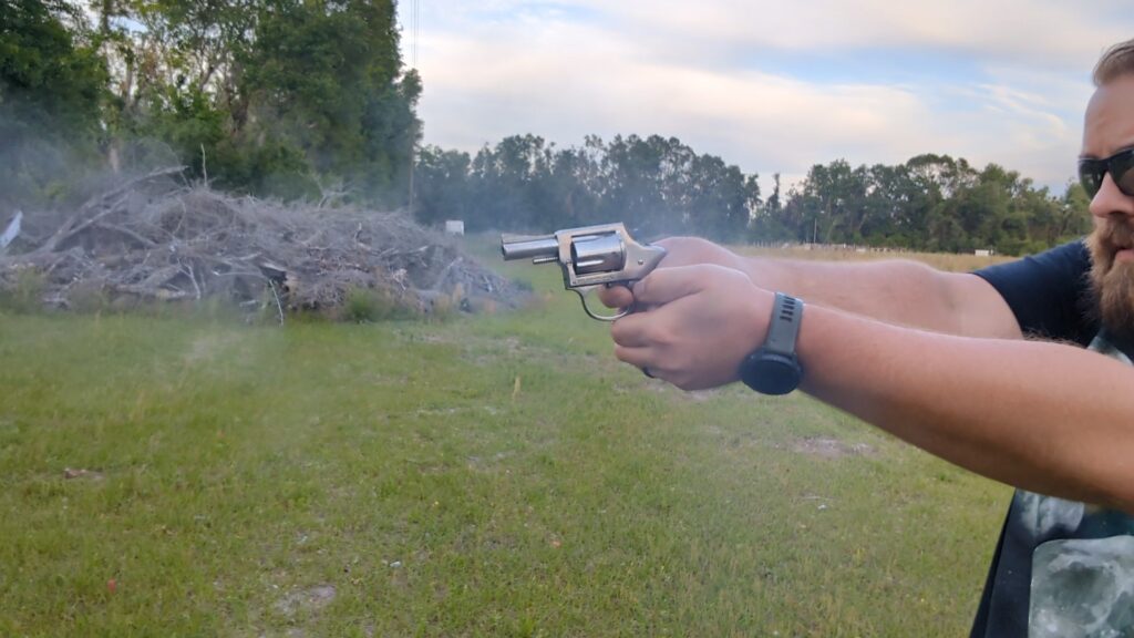 The gun has a 2.5-inch barrel and a rather small frame. Its grip is awkward and feels far from ergonomic, but it works. Iver Johnson chose to go with a huge trigger guard for one reason or another. It seems a bit large for a gun meant to be small. Finally, you can remove the cylinder and use the removable rod to punch out spent cartridges.