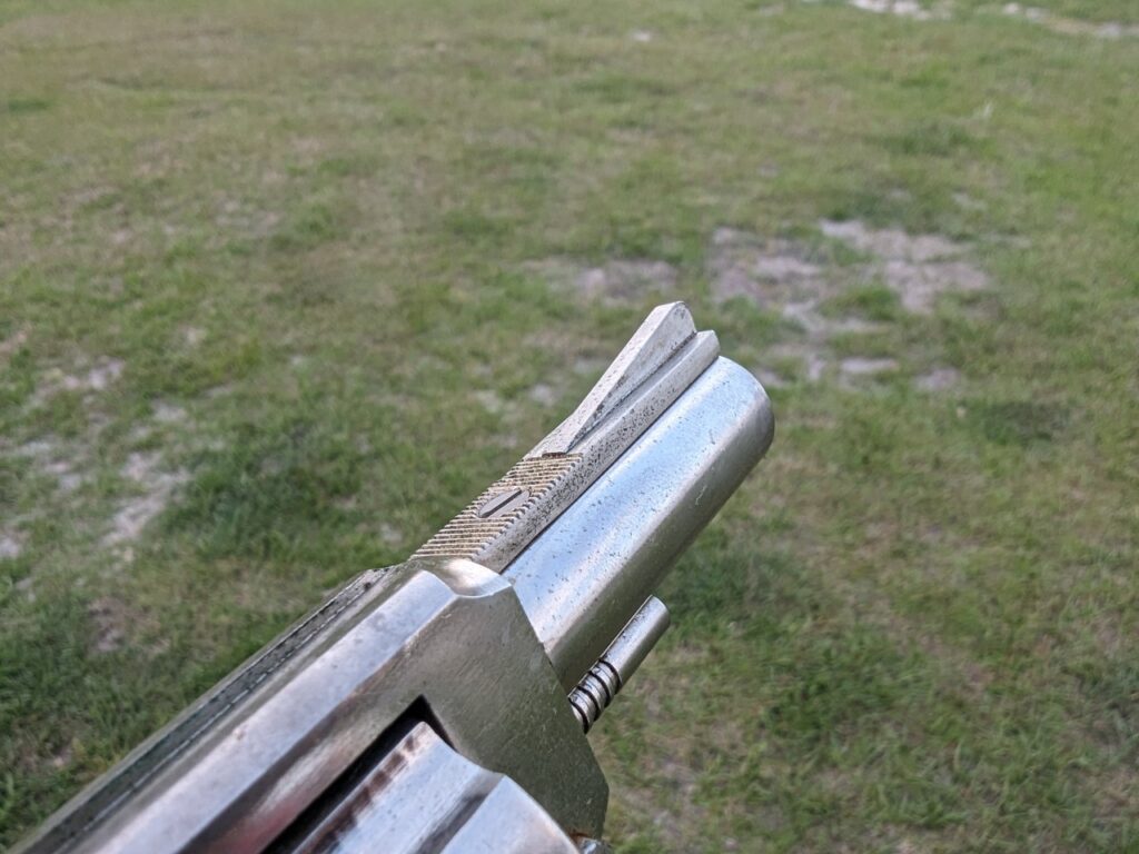 The 55-SA has a long, heavy double-action trigger, but it’s pretty smooth. It won’t win awards, but I can easily hit a 10-inch gong at 15 yards. The hammer blocking the rear sight causes the most issues, and single action makes shooting the gun accurately much easier.