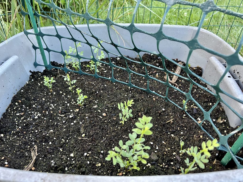 I planted mine from a bag of store lentils that I had opened in my pantry. All my research says that it’s fine (and easy) to do that. I put them in tubs of soil that last year had grown peppers (crop rotation, remember?). I also added a low jury-rigged “trellis” for them to climb (made out of reused stuff I had leftover from previous years), as apparently though short, they do like support.