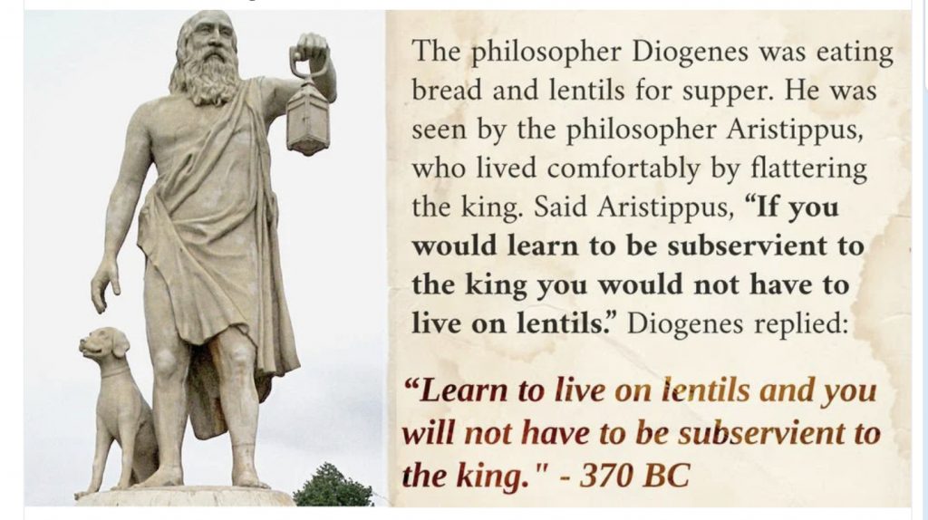 To balance out the snotty liberal piece about lentils I thought I’d leave you with a different take. It involves the Greek philosopher Diogenes and lentils – here ya go.