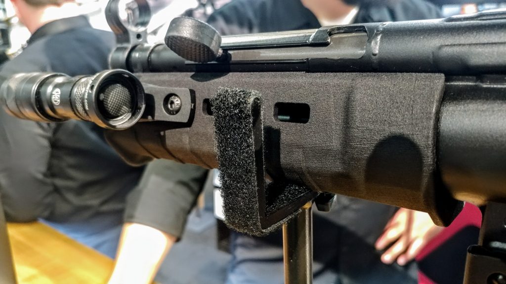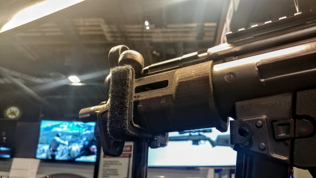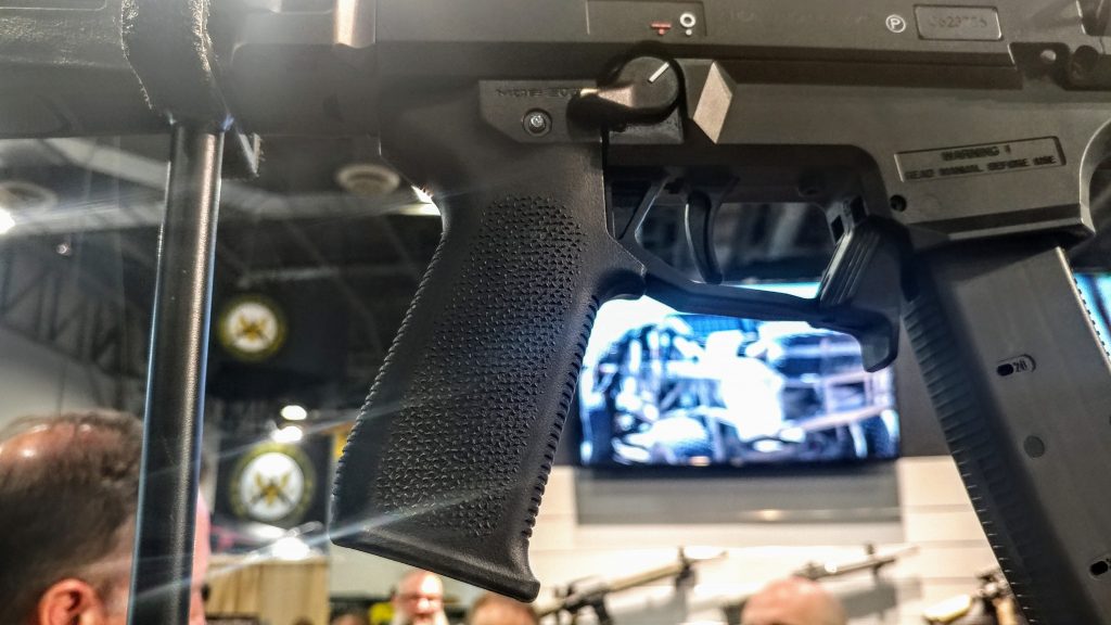 That’s not the only PCC gear Magpul is bringing in for the Scorpion. They are also producing an extended ambidextrous magazine paddle. This is known as the Evo Enhanced Magazine release paddle. Right behind that, we have the EVO grip, a replacement for the CZ stock pistol grip. It has an enhanced texture and a more comfortable angle. It looks and feels a lot like the standard Magpul AK and AR pistol grips.
