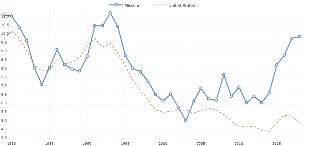 Then we throw Missouri under the bus, completely disregarding its different socio-economic status and placing it 1:1 with Connecticut. Political science is fun, isn’t it? No controlling for variables, just get a number and make it about the thing you want.