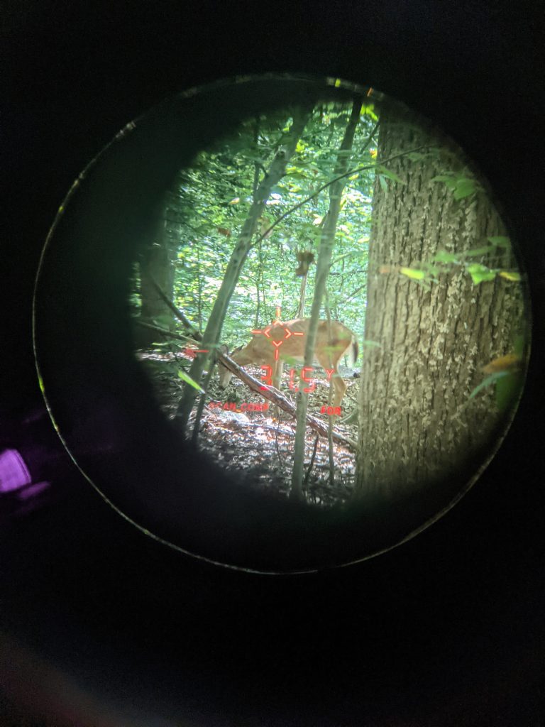 On my last visit to the club, I was walking the trail out to the second half of the field course to practice when I noticed movement and heard rustling about 15 yards to my 2 o’clock. It was a doe I had spooked! She ran a short while before stopping behind a tree. I had time to gently set my bow down and grab the RF.1 from my pants pocket, and was able to range her, standing perfectly broadside. I then got my phone out and snapped a pic through the RF.1 (attached here). Being able to quickly use this rangefinder to check distance on a live target was amazing. It was a huge confidence boost, knowing that I should be able to do this on a hunt.