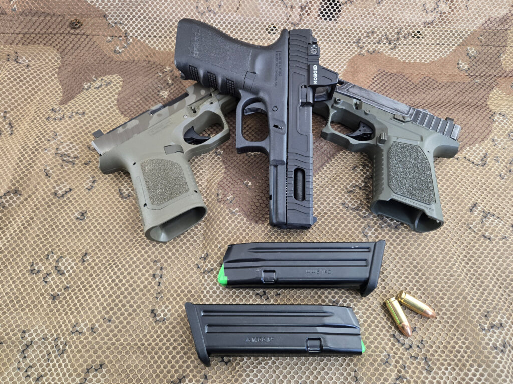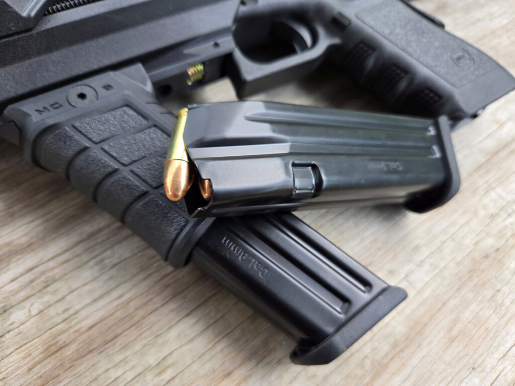 I tried the mags in my Gen 3 Glock 17 in pistol mode as well as in the FAB Defense AMP carbine conversion kit. My Glock is SBR’d. I also used it with a Glock 45, which is my current duty gun. For some variety, I also tried it in an SCT Glock 17 and 19 frame, a similar old Strike Industries 80% frame, two Polymer 80 full-sized frames, and an 80% Arms GST-9 frame.