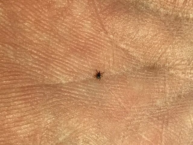 (Photo by Mike Lychock)- The size of a nymph deer tick is very hard to see and blends with dark colors. They are easier to spot on skin and light-colored clothing.