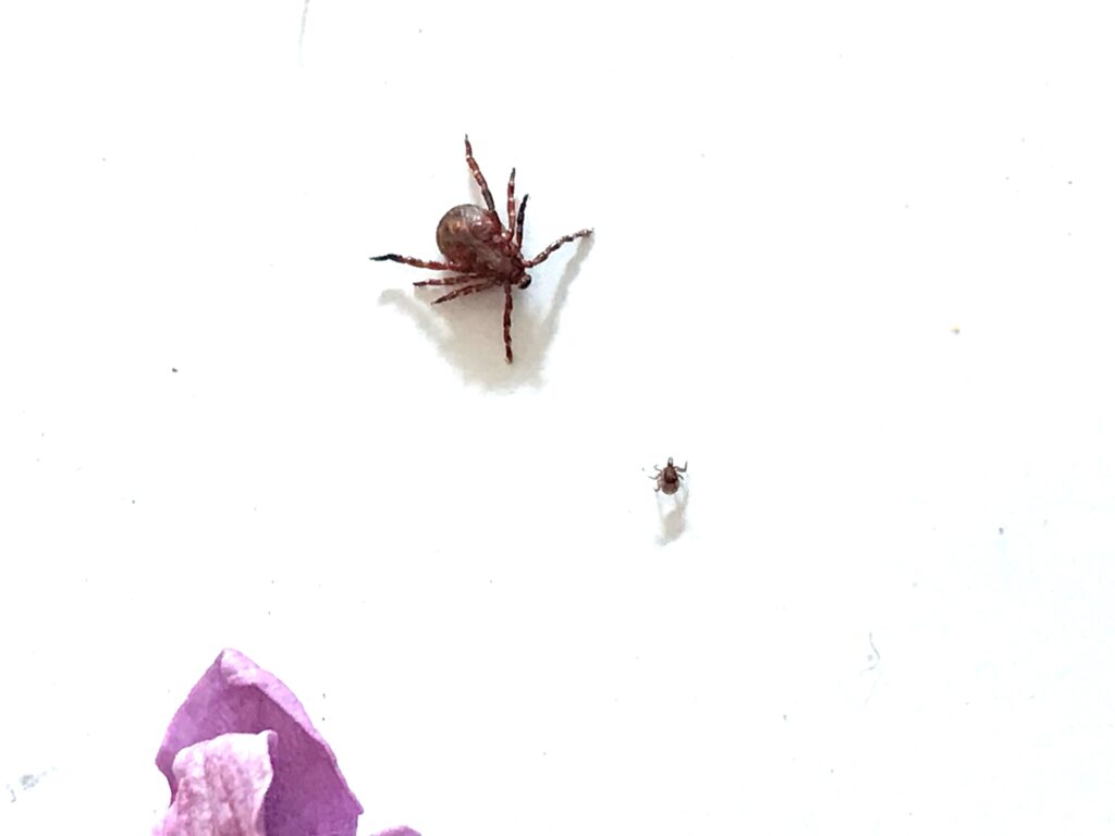 (Photo by Mike Lychock)- The larger brown dog tick is more dominant than the smaller blacklegged deer tick nymph.