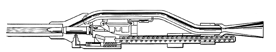 The round utilized a partially combustible cartridge, with only the base of the cartridge ejecting upon firing. The system employed a locked breech but used a funnel system to vent excess gas rearward and out of the gun. This made it recoilless, or at the very least, semi-recoilless.