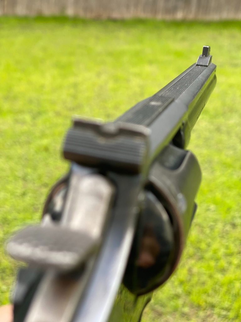 Smith and Wesson’s “model number nomenclature” did not become a thing until the year 1957, so prior to that guns just had names like Military & Police, Registered Magnum, Target Masterpiece, Combat Masterpiece, etc. The Model 14 in particular was known as the K-38 Target Masterpiece. While nowadays a six inch barrel on a revolver might be seen as too long and not the first choice, the majority of target revolvers of yesteryear were built with such barrel lengths in mind. Besides these longer barrels, the Model 14 had adjustable target sights which might as well have been the mounted dot sight equivalent of their day, especially if one compares the rudimentary sights found on basic service or general purpose revolvers back then. More basic guns had a rear sight that milled through the revolver’s topstrap and the front sight was just a rudimentary blade fixed in place. On the other hand, the Model 14 specifically had Patridge sights. E. E. Patridge came up with his design in the late 1890s and these quickly became the go-to for accuracy oriented target pistols. A thick front sight blade lines up evenly in front of a square notch while still allowing some light on either side of the front blade. The sight picture this arrangement provides is ideal for a 6 o’clock hold when shooting bullseye targets.