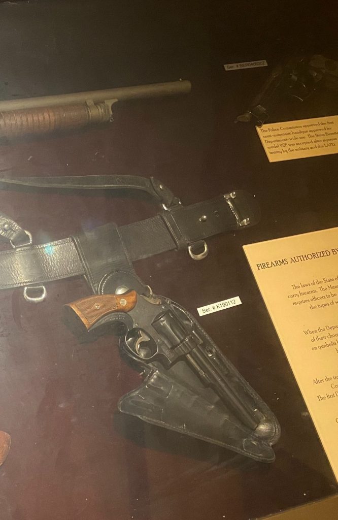 Like these archaic handgun games, police shooting tactics then placed a heavier focus on accuracy and standards were more stringent then than they are today. According to Darryl Bolke of HiTS, shooting scores and critical accuracy were held in extremely high regard by police culture of the era, and many departments and agencies already had decades using six inch barreled target revolvers as duty weapons. It comes with no surprise that the Model 14 revolver was an approved pistol that was extensively used by the Los Angeles Police Department during this time period. Officers were originally issued the perennial 158gr LRN standard .38 Special loads. Typically officers carried a fully loaded cylinder and 12 additional cartridges in some drop pouches with the addition of perhaps a back up snub nosed revolver as well. That is a total of 18-23 rounds on board. Every shot had to count. Revolvers like the Model 14 were carried in very old school break open clamshell holsters. These archaic holsters split open from the front in order to make it easier to draw a revolver with a [relatively long] barrel efficiently.