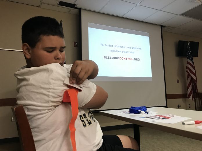 This is parenting in the modern age: educating our children about a variety of threats and giving them tools and skills to stay safe. Whether it is pool safety, cooking safety, stranger danger, or active shooter, parents must provide age-appropriate information. We prepare our children for different scenarios and give them tools to succeed. They know STOP – DROP – ROLL, and have fire drills and tornado drills to educate them on how to stay safe in those situations. Schools have an automated external defibrillators (AEDs) in case of heart trauma and many are now stocking trauma kits to stop life-threatening bleeding.