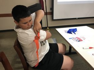It took only 8 minutes for EMS to get to my house from 0.7 miles away, and that would have been too late if there was life-threatening bleeding. In the case of a mass murderer, EMTs would not be able to aid victims until after police clear the scene, so even if help arrives on the scene immediately they would not get to my children in time. Death from blood loss is preventable with the right equipment and training; my children may be able to stop the bleeding until EMTs can get them to a hospital. This realization positively reinforced my decision to enroll my son in the class, and he happily accepted this basic information.