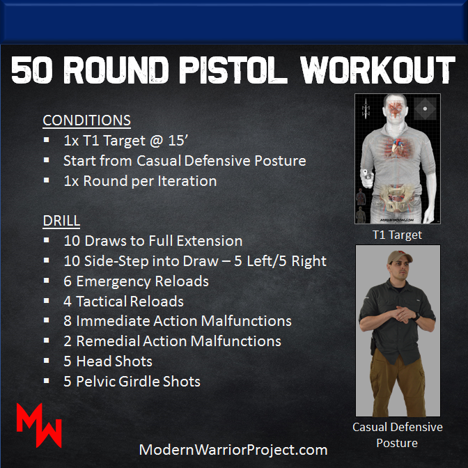 The Modern Warrior pistol workout is also a simple set of drills designed to exercise the basics of combat handgun skills. The drill needs a box of ammo, a magazine pouch, two magazines, a T1 Target and is shot at 15 feet.