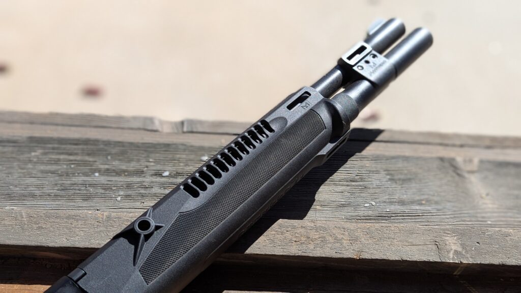 Let’s start at the tip of the barrel and work our way back, cataloging the improvements the SPX model has over the standard model. The front sight is a rifle-style design that flows rearward into barrel clamps, outfitted with an M-LOK slot and sling swivel. Then, we get into the uber awesome SPX handguard.