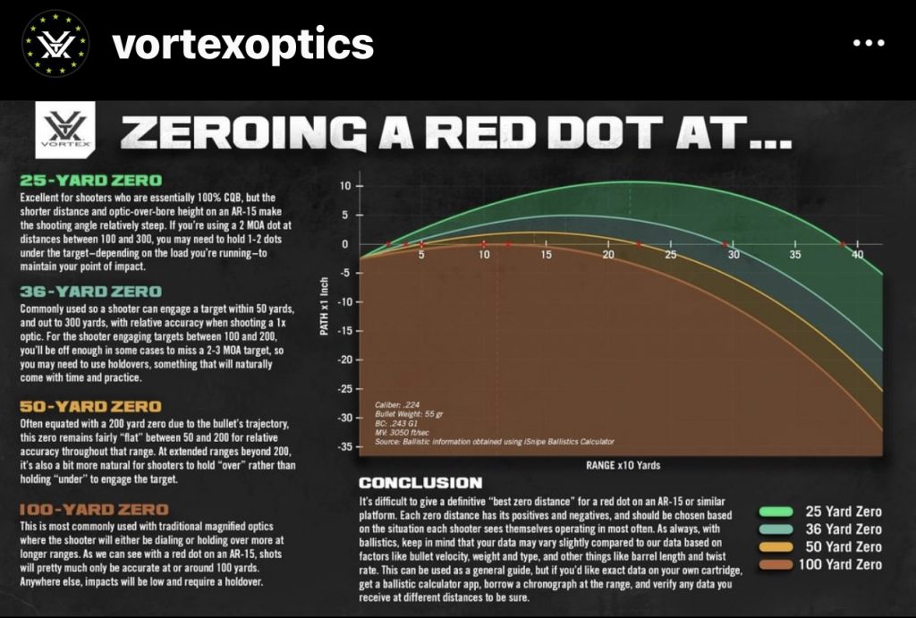 A 50 yard dot zero on an AR is not the same as a SCAR or X95, but in general real world effects, close enough really is close enough. You can always shoot live to confirm the POI. Alternatively, like Vortex did here, put the info into a ballistic app with accurate optic height, BC of your ammo, and its muzzle velocity and you’ll see your trajectory more than well enough for carbine work.