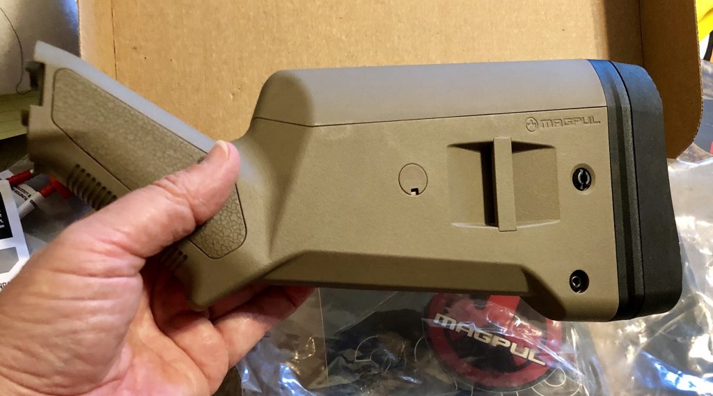 But it isn’t just the solvents that are getting to me. Some of it is the bargain-hunting process that is endangering my cognitive function. I got a fantastic deal on Amazon for a Magpul SGA replacement stock. It was listed as “used, in damaged original package”, and it was $23 cheaper than new. That was my score-of-the-month. It arrived in perfect condition and I am just tickled.