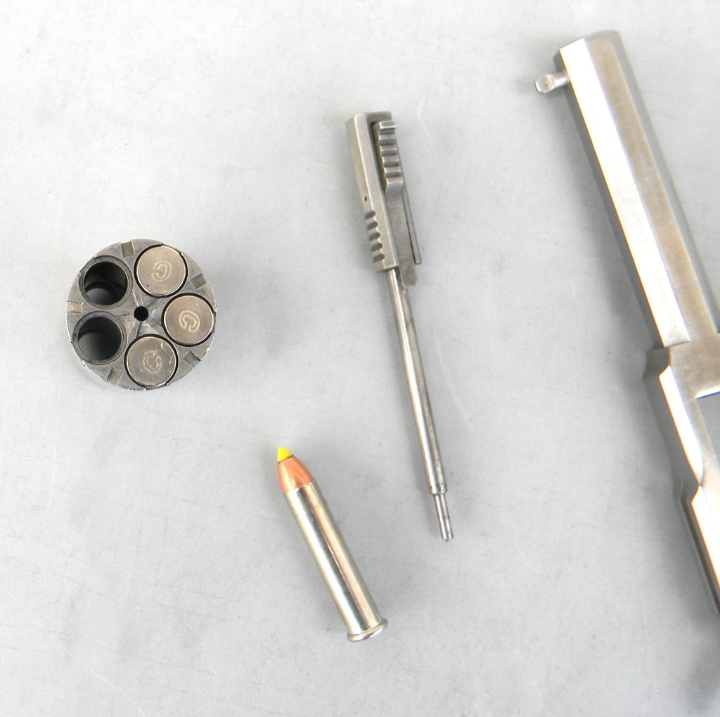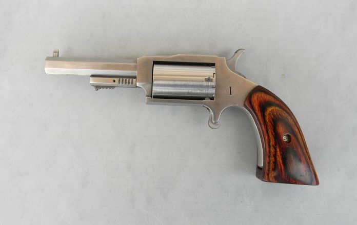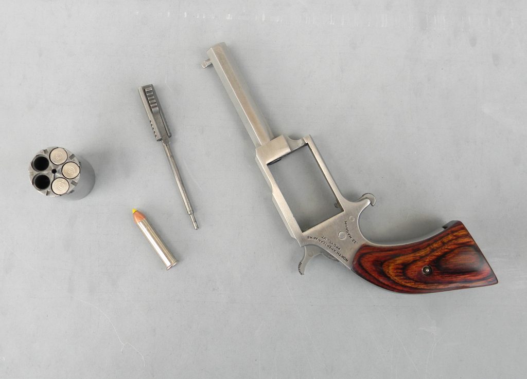 A revolver that seems to be owned by practically every handgun crank although they don’t always admit carrying it is the North American Arms single action revolver. It is well made of good material. Some of the smallest examples are difficult to use well. Most are solid frame revolvers with a base pin that is removed to unloose the cylinder from the frame. There are break top and swing out cylinder versions and interchangeable cylinder revolvers as well. My example is a much improved shooter. The Sheriff features a three inch barrel and boot grip. The Sheriff features the standard base pin and cylinder design. The base pin must be pulled forward to allow removal of the cylinder. The cartridges are loaded one at a time then the cylinder is locked back in place. To unload the revolver the same procedure is followed. To safely carry the revolver the hammer spur must be lowered into a safety notch between cylinders. If you are not absolutely certain you are able to be certain you have the hammer properly placed in the safety notch then load only four cartridges in the five shot cylinder. To fire the revolver the hammer is cocked and the spur trigger pressed. The hammer must be cocked for every shot. No trigger guard is needed as the hammer is down and at rest and a press on the trigger cannot cock the hammer. As you may imagine drawing the NAA revolver cocking the hammer and firing must be practiced often to provide any degree of protection.