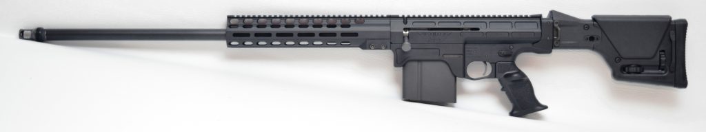 Bellator™ is designed with the modularity of the AR platform. It uses drop in AR trigger, selector, take-down pin, grip and magazine release. It has a user changeable barrel system, bolt and magazine well. The bolt is designed with a forward located left hand handle and right hand eject. To convert from 338 Lapua Mag to 300 Norma Mag is simply done by changing out the barrel. These 2 calibers use same bolt and 10 rd box magazine. Conversion from 338 Lapua Mag size to .308 size is done by changing out the barrel, bolt and magazine well. When converted to .308/6.5Creedmoor it uses standard AR10 metal or Magpul Pmags. Rifle comes with a folding fully adjustable stock or non-folding fully adjustable Magpul PRS stock.