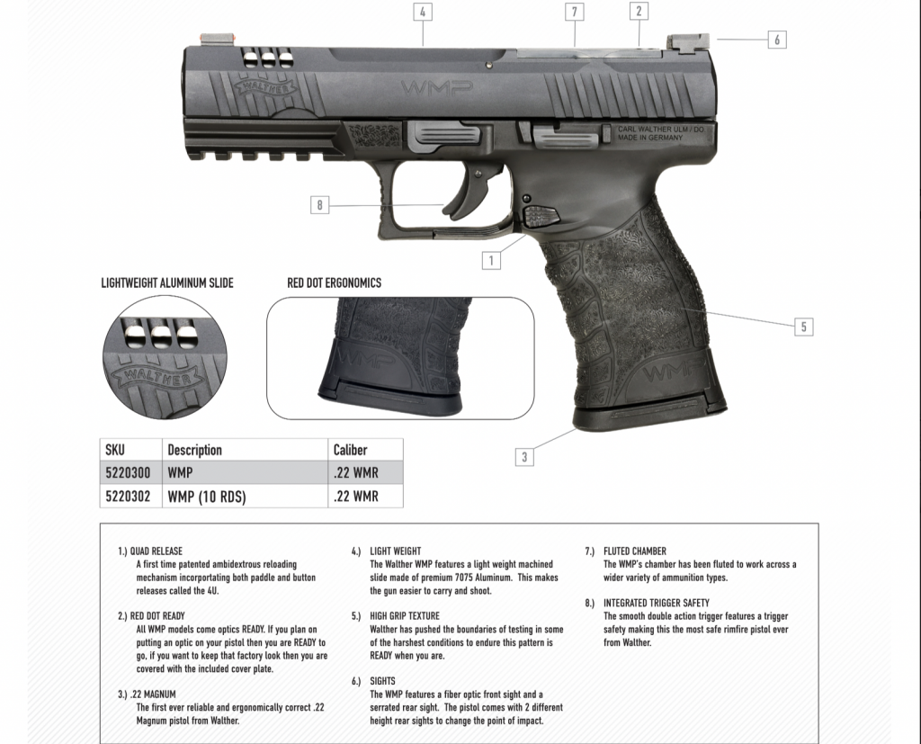 In life, sometimes the unexpected can happen. Whether it’s an opportunity for fun and recreation or maybe even a life-threatening situation, it’s your duty to be READY. So, when it’s time to hit the outdoors and you need a reliable firearm at your side, the Walther Magnum Pistol (WMP), 22 magnum semi-automatic is the only choice. This isn’t just another target practice plinker, this pistol is a high quality, lightweight, easy-to-shoot and affordable option for shooters who want to stay READY while maintaining an active lifestyle.