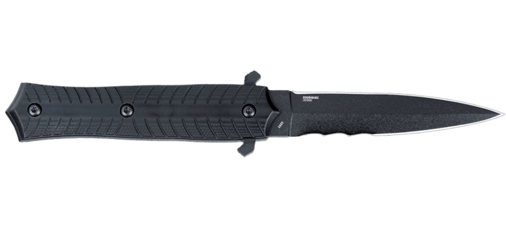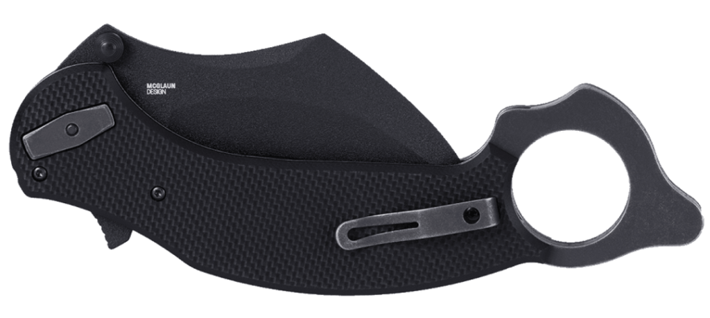 It’s fitted with a smaller, but still good sized 3.6 inch blade of D2 steel. The blade is deployed with either a flipper, or the dual thumb studs. It’s assisted opening, too. So, it’s fast to get into play. The Du Hoc has a black G10 handle with thumb ring, and a black powder finish on the blade.