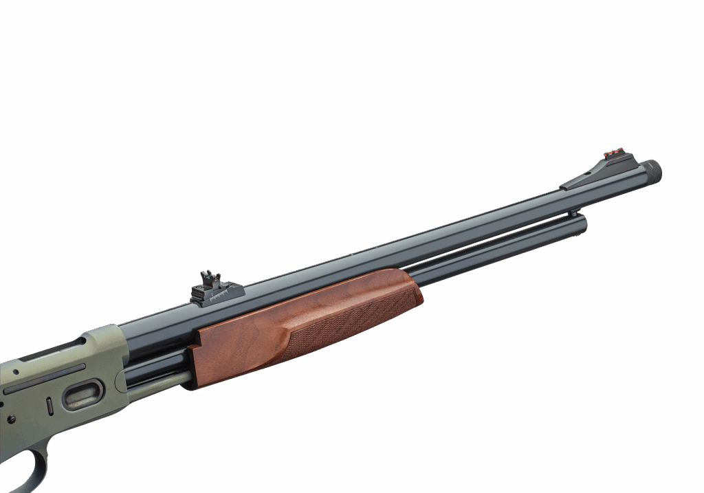 The Pedersoli Jackal 44 has a 19-inch barrel with 5/8” x 24 threading. It’s equipped with an adjustable fiber optic rear sight and a fiber optic front sight. The barrel is tapped to accept a Picatinny rail for optics mounting. It uses an under-barrel magazine tube that holds six rounds.