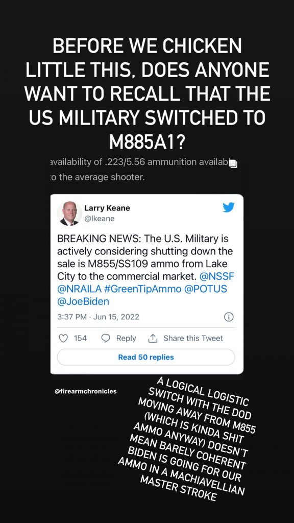 So, I’m not saying the calculations that this would change the amount of 5.56 NATO on the open market, and remove a direct government source of ammo which could be criticized, and stop sending ‘armor piercing bullets’ into public hands weren’t all talking points that could be exploited by the Biden camp as ‘further steps he is taking to reduce gun violence’ and so forth. I’m simply pointing out that the government telling Lake City to stop selling something they aren’t making, because they’re making M855A1 instead, is like telling Ford they can’t sell the 2022 Focus.