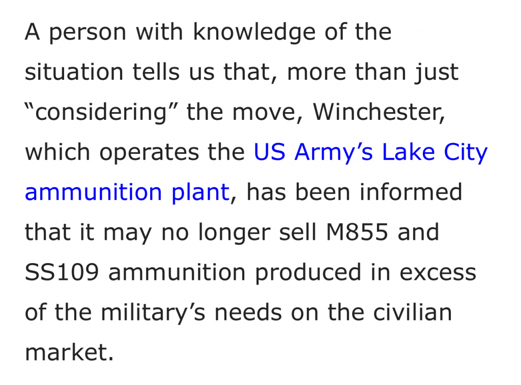 But let me direct you to the final bit. “M855 and SS109 ammunition produced in excess of the military’s needs”