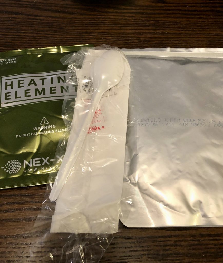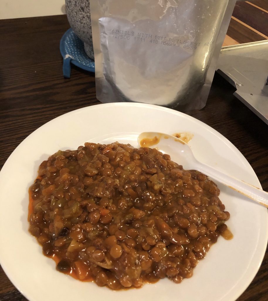 The spoon and napkin package came with salt and pepper packets, but I didn’t feel that my entree needed extra seasoning. I thought it was fairly tasty for a pre-packaged shelf stable meal. It didn’t look much like the package photo, but what prepared food does? There was a fair amount of meat, and the beans and lentils made it filling. Lentils are also pretty high in dietary fiber, so one should not experience the usual problem common with MRE’s (Meals Refusing to Exit) – at least with this particular entree.