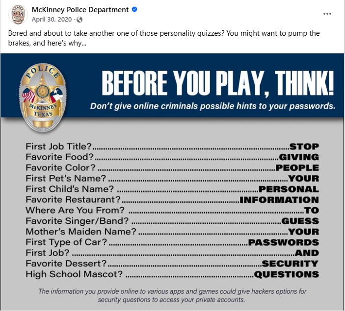 One last thing regarding keeping your online accounts secure. You know those fun little questionnaires that get passed around on social media? Avoid jumping on that particular bandwagon.